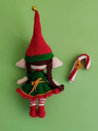 Boneca artesanal em amigurumi, perfeita para decoração de Natal. Tem 25 cm. - Feita à mão com fio. - Design de duende natalina. - Detalhes em crochê.