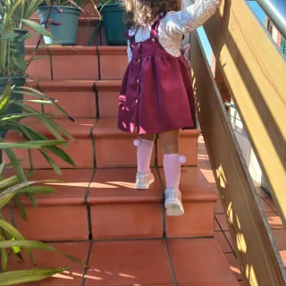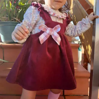 Conjunto de vestido tipo bombazine bordô com blusa estampada. - Vestido com laço xadrez. - Gola com folhos. - Mangas compridas.