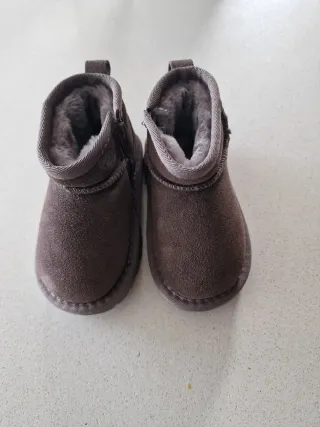 Botas confortáveis para criança, em tamanho unisexo. Novas, nunca usadas. UGQ - Material exterior em camurça. - Interior forrado com pelo sintético macio. - Fecho lateral para facilitar o calçar.