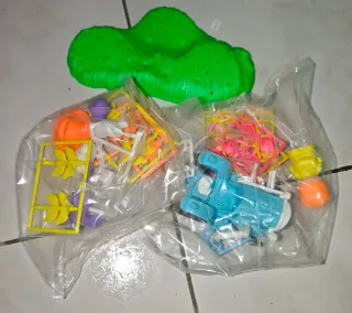 Conjunto Pinypon vintage da Famosa, de 1988. Inclui figuras e acessórios. - Boneco espantalho roxo. - Flores em tons de laranja e rosa. - Coelho rosa e branco. - Trator azul com condutor. - Elementos de cenário verde. - Caixa poderá estar danificada