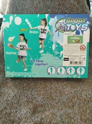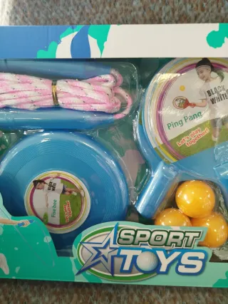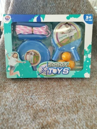 Conjunto de 4 brinquedos desportivos para crianças. - Inclui corda de saltar, frisbee, raquetes de ping pong e bolas. - Idade recomendada: 3+ anos. - Marca: BONGDALON.