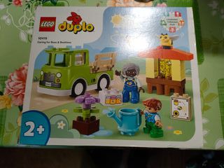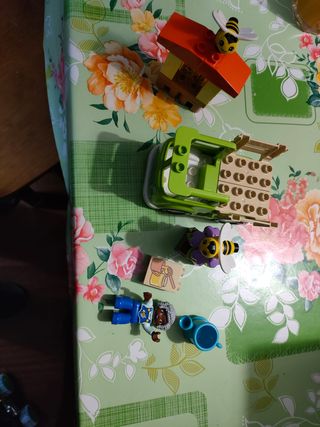 Conjunto LEGO Duplo 10419, Cuidando Abelhas e Colmeias. Ideal para crianças a partir de 2 anos. Faltam 2 peças- 1 dos homens e a peça branca com os 3 frascos de mel - Inclui figuras de pessoas, abelhas e uma colmeia. - Contém um camião verde e acessórios como regador e flores. - Promove o aprendizado através da brincadeira.
