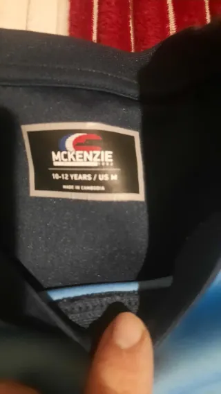 Camisola da marca McKenzie em azul marinho e azul claro, com detalhes em branco. Ideal para o dia a dia. - Tamanho: 12-13 anos. - Design com painel frontal em azul claro. - Gola redonda e mangas compridas.