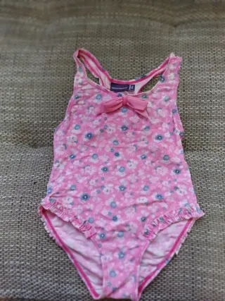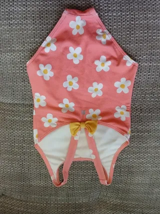 Fato de banho para menina da marca Nabaiji, tamanho 4/5 anos. Apresenta um padrão alegre de flores brancas com centro amarelo sobre um fundo rosa. - Padrão de flores. - Cor rosa. - Tamanho 4/5 anos.