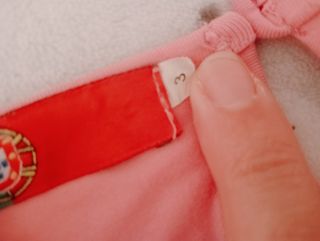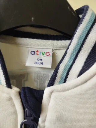 Casaco infantil da marca Ativo, tamanho 12 meses. - Cor principal branca com mangas e detalhes em azul marinho. - Estampa de urso bordado no peito esquerdo. - Número 85 bordado no peito direito. - Gola, punhos e barra com listras em azul marinho e claro.