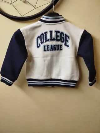 Casaco estilo bomber para menino, tamanho 24 meses. - Mangas em azul marinho. - Corpo em branco. - Detalhes de riscas azuis e brancas na gola e punhos. - Bordado COLLEGE LEAGUE nas costas.