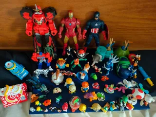 Diversos brinquedos para colecionadores ou para oferecer. - Preço unitário de 1€ na compra de vários. - Variedade de personagens e figuras. - Ideal para quem procura peças específicas para completar coleções.