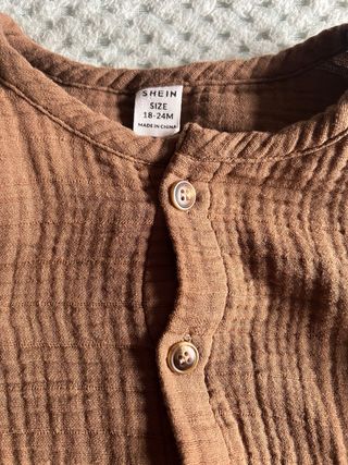 Jardineira castanha de manga curta para menino. - Tecido canelado. - Fecho de botões à frente. - Bolsos laterais.