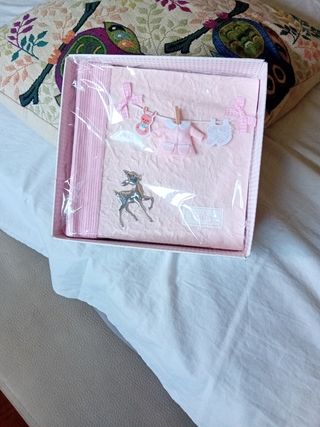 Álbum de bebê para menina, delicado e charmoso. Ideal para guardar fotos e lembranças preciosas dos primeiros momentos. - Álbum na cor rosa claro. - Acompanha um delicado enfeite de rena em prata. - Apresenta miniaturas de roupinhas de bebê.