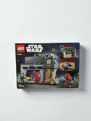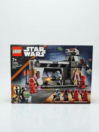 Conjunto LEGO Star Wars 75386, Batalha entre Paz Vizsla e Moff Gideon. - Inclui figuras de Paz Vizsla, Moff Gideon e Guardas Pretorianos Imperiais. - Ação inspirada na série The Mandalorian.