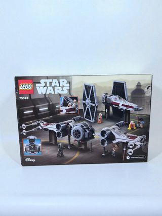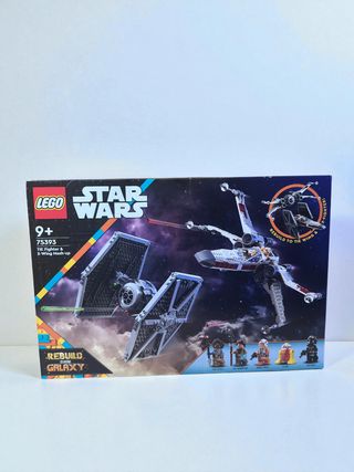 Conjunto LEGO Star Wars 75393 que combina un TIE Fighter y un X-Wing. - Incluye 5 minifiguras: TIE Pilot, TIE Bomber, Rebel Pilot, R2-Q2 y un droide. - El set permite construir el TIE Fighter, el X-Wing o un modelo combinado. - Inspirado en la saga Star Wars.