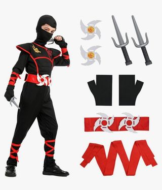 Traje de ninja para criança, novo! Ideal para festas ou brincadeiras. Tamanho 5-7 anos. Medida do fato: 95cm. Inclui máscara, cinto com shurikens, 2 adagas, 2 luvas e 4 tiras vermelhas. O conjunto é predominantemente preto com detalhes vermelhos. - Máscara facial - Cinto com shurikens - Duas adagas - Duas luvas - Quatro tiras vermelhas