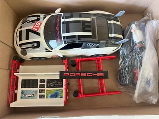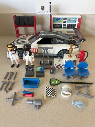 Conjunto Playmobil do Porsche 911 GT3 Cup completo e com caixa original. - Inclui piloto e mecânico. - Todos os acessórios de oficina e corrida. - Pódio com troféu e extintor. - Pneus e ferramentas.