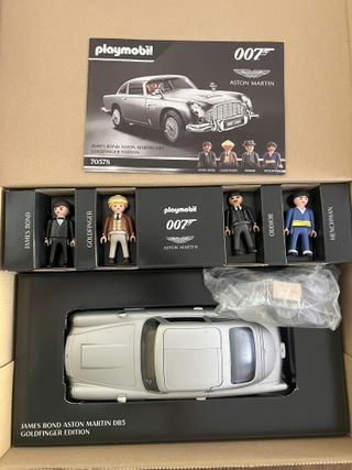 Conjunto Playmobil do Aston Martin DB5 Edição Goldfinger. Set completo e na caixa original - Inclui as figuras de James Bond, Goldfinger, Oddjob e Henchman. - O Aston Martin DB5 é prateado.
