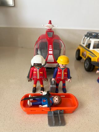 Conjunto de equipa de resgate Playmobil com vários veículos e figuras. Set COMPLETOS vendidos em conjunto: 9127, 9128, 9139 - Helicóptero de resgate vermelho. - Veículo todo-o-terreno amarelo. - Moto 4 com reboque e maca. - Figuras de equipa de resgate. - Cão de resgate. - Acessórios de resgate. Nota: sem caixas originais