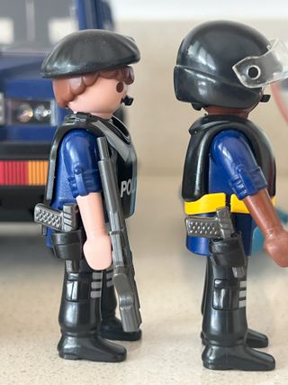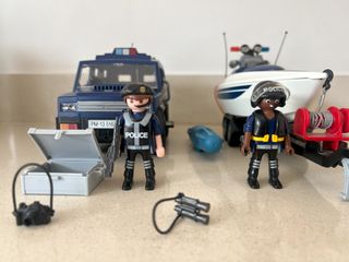 Conjunto de figuras de ação da polícia PLAYMOBIL. - Inclui dois agentes da polícia. - Acessórios como arma, colete e capacete. - Inclui um veículo policial e um barco. - Acessórios adicionais como uma caixa e binóculos. Nota: SET completo sem caixa original e sem instruções