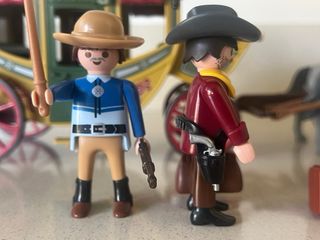 Conjunto Playmobil Western com uma diligência. - Inclui dois bonecos de cowboy. - Duas figuras de cavalos. - Acessórios como mala e baú com moedas. Set 70013 completo (sem caixa original