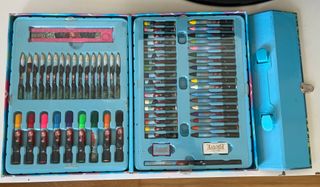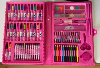 Maleta/estojo de pintura com o tema das Princesas Disney. Perfeita para guardar materiais de arte. - Inclui: 24 canetas, 24 lápis de cera (grandes e pequenos), 12 lápis de cor, 12 aguarelas, 1 régua, 1 afia-lápis, 1 tesoura, 1 borracha, 1 esponja, 1 pincel, 1 cola, 1 lápis - Alça para transporte