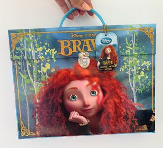 Maleta/estojo de pintura com a personagem Mérida do filme Brave da Disney Pixar. -Inclui: 36 lápis de cera (grandes e pequenos), 16 lápis de cor, 9 canetas, 1 régua, 1 afia, 1 borracha e 1 lápis. - Apenas 4 elementos já foram um pouco utilizados. - Alça para transporte.