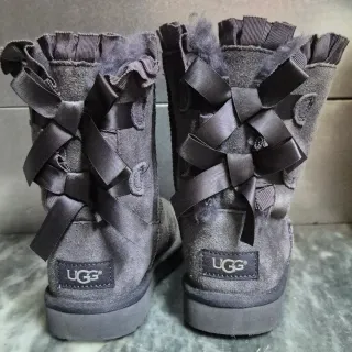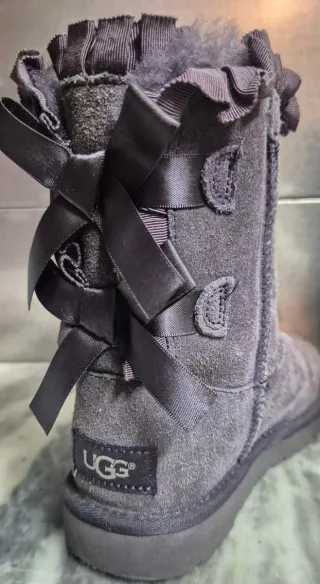 Botas UGG originais para criança, tamanho 31. Cor cinza escuro com detalhes de laços e folhos. - Material exterior em camurça. - Forro interior em lã. - Laços pretos nas costas. - Detalhe de folhos na parte superior.
