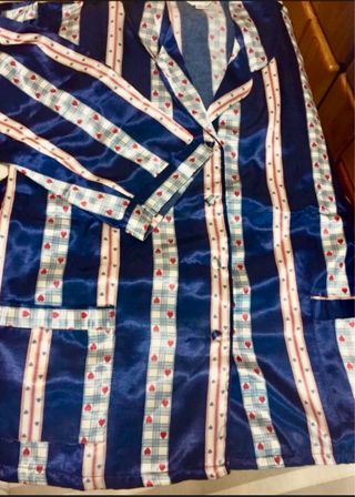 Pijama de rapaz de duas peças, calças e manga comprida. Tecido acetinado azul e interior cardado. Marcado com tamanho 16 mas veste pequeno tamanho 10.