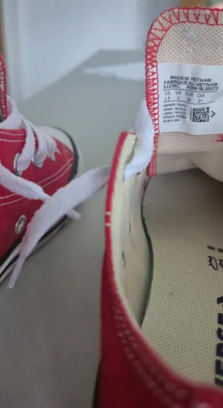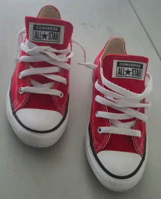 Sapatilhas clássicas em vermelho, tamanho 34. - Design icónico All Star. - Cadarços brancos. - Sola de borracha branca.
