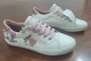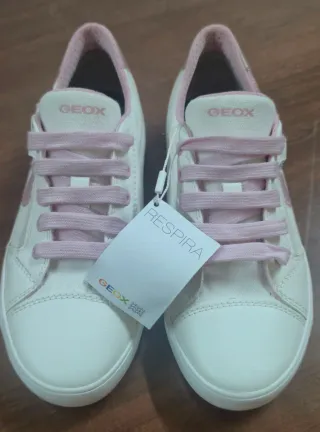 Sapatilhas da marca Geox em tamanho 34. - Cor branca com detalhes em rosa. - Fecho com atacadores. - Etiqueta RESPIRA da Geox.