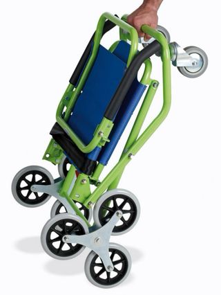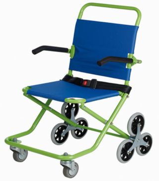 Cadeira de transporte com rodas para subir e descer escadas. Possui estrutura metálica verde e assento e encosto em tecido azul. - Cinto de segurança. - Apoios de braço pretos. - Rodas dianteiras giratórias. - Sistema de rodas triplas na parte traseira para escadas.