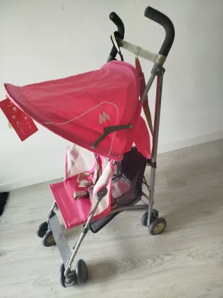 Carrinho de bebê Maclaren, modelo Mark. - Capota rosa. - Estrutura metálica. - Alças prata