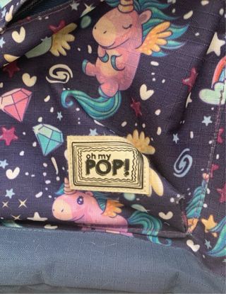 Mochila infantil com um divertido padrão de unicórnios e estrelas. A marca é Oh My Pop!. - Design colorido com unicórnios, estrelas e diamantes. - Fecho de correr. - Alças ajustáveis. - Material resistente.