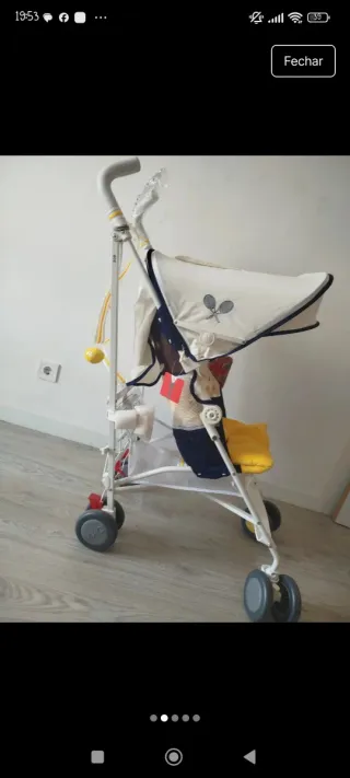 Carrinho de bebê Maclaren modelo Ace, com assento acolchoado em amarelo. - Estrutura branca e detalhes em azul. - Cintos de segurança. - Capota. - Rodas com detalhes em amarelo.