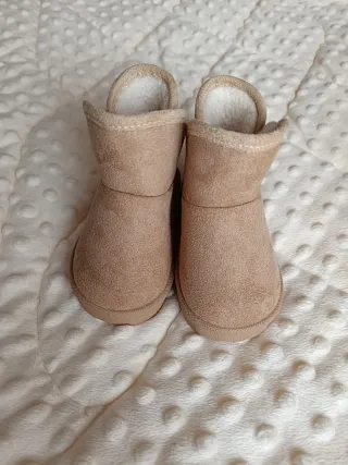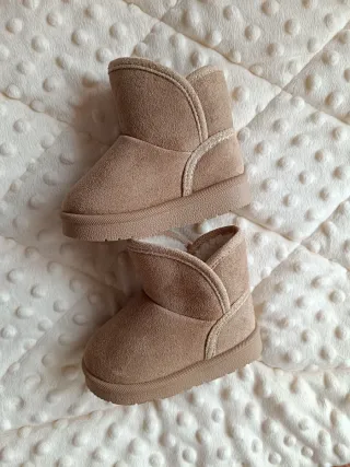 Botas beges para bebé, perfeitas para manter os pés quentinhos. - Material exterior em camurça sintética. - Interior forrado com pelo sintético macio. - Sola antiderrapante.