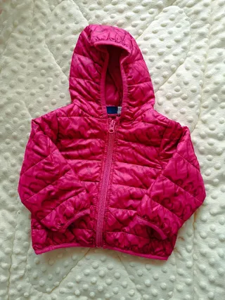 Casaco impermeável rosa com um padrão subtil. Tamanho 12 meses, da Chicco - Capuz. - Fecho de correr frontal. - Padrão de corações em relevo.