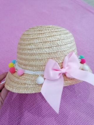 Conjunto de chapéu e mala à tiracolo para menina. Em palha. Lacinho em cetim e pompons.