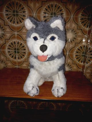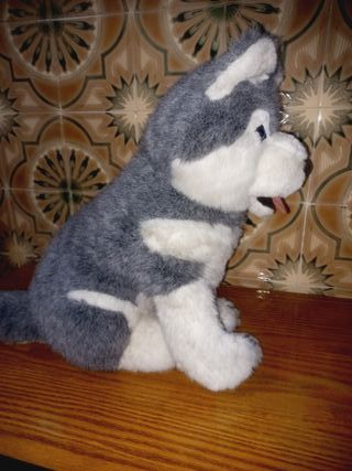 Cão de peluche com interior macio e imenso pêlo exterior. Adquirido nos anos 80. Em excelente estado e estimado. 30cm de comprimento e 50cm com a cauda 40cm de altura - Design de cão husky. - Material de pelúcia macia. - Detalhes em cinza e branco.