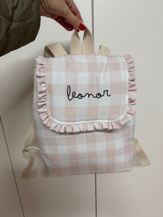 Mochila infantil com um padrão xadrez em tons de rosa e branco, com um delicado folho à volta da aba. O nome Leonor está bordado a preto na aba. - Padrão xadrez rosa e branco. - Detalhe de folho na aba. - Nome Leonor bordado.