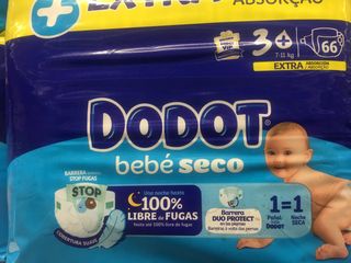 Fraldas Dodot Bebé Seco, tamanho 3, para bebés entre 7-11 kg. Com absorção extra para uma noite seca. - Barreira Duplo Protect nas pernas. - 100% livre de fugas. - 66 fraldas na embalagem.