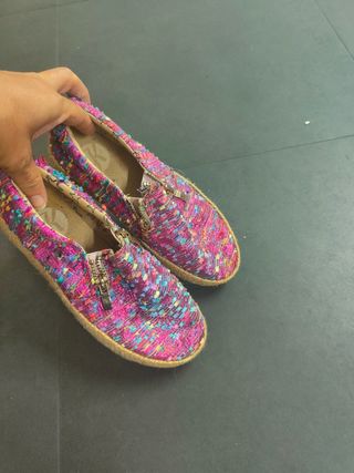 Tenho para venda um par de sapatilhas para menina, na cor rosa. São do tamanho 34 e não têm atacadores. As sapatilhas são coloridas e têm um design alegre. - Tamanho: 34- Sem cordões- Cores vibrantes