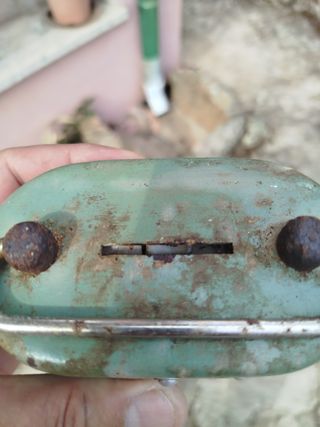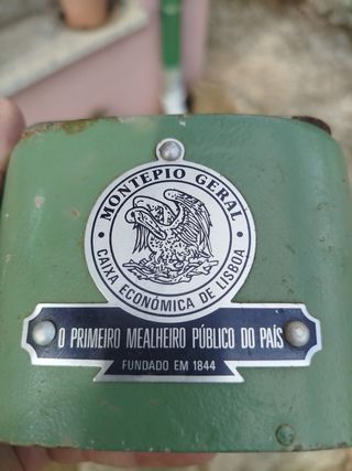 Mealheiro antigo da Caixa Económica de Lisboa, fundado em 1844. - Apresenta o brasão com a águia. - Inscrição O Primeiro Mealheiro Público do País.