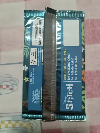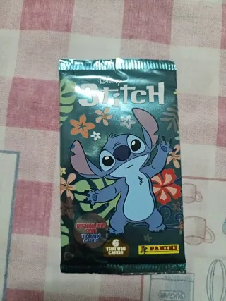 Pacote de cartas colecionáveis do Disney Stitch. - Contém 6 cartas. - Inclui cartas Sparkling Gum. - Marca Panini.