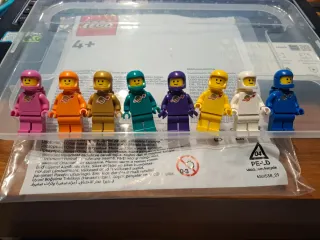 Conjunto de 8 figuras Lego Classic Space com capacetes e emblemas. - 8 figuras diferentes. - Cores variadas: rosa, laranja, dourado, verde, roxo, amarelo, branco e azul. - Cada figura tem um capacete e um torso com um emblema de planeta.