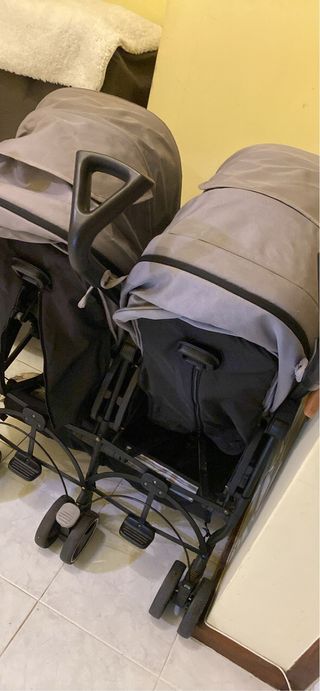 Carrinho de bebê duplo para passeios. Ideal para transportar duas crianças com conforto e segurança. - Estrutura resistente. - Capotas ajustáveis. - Rodas para fácil locomoção.