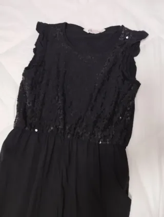 Macacão preto para menina, tamanho 10 anos, com detalhes em lantejoulas. Mede 83 cm desde a cintura. - Decote redondo. - Mangas curtas com folhos. - Cintura elástica. - Bolsos laterais.