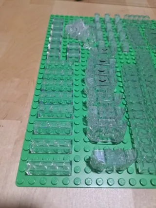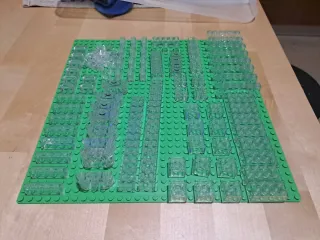 Conjunto de peças Lego em material translúcido. - Diversos tamanhos e formatos. - Ideal para construções criativas.