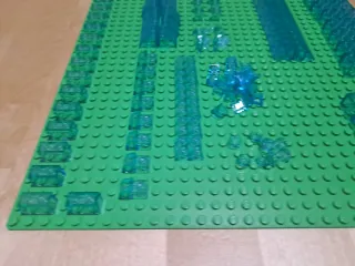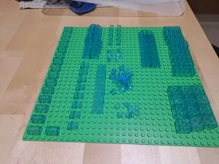 Conjunto de peças Lego em azul translúcido. - Peças variadas para construção. - Cor azul vibrante e translúcida.