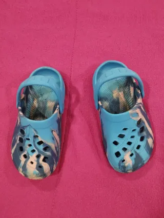 Par de Crocs infantis em azul com um padrão divertido. - Tamanho 26/27. - Design com aberturas para ventilação.