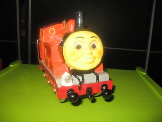 Mealheiro em forma de comboio, feito de cerâmica. - Design divertido e colorido. - Ideal para guardar moedas e notas.