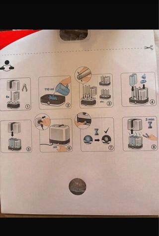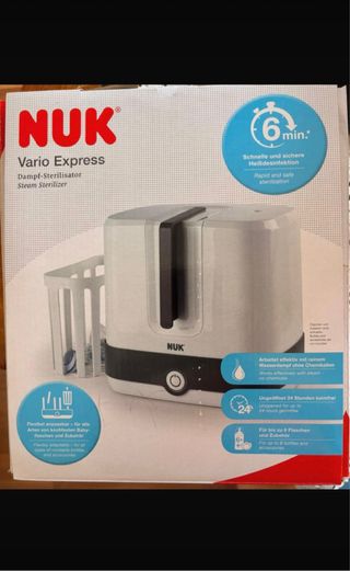 Esterilizador a vapor NUK Vario Express. - Esteriliza en 6 minutos. - Funciona con vapor de agua, sin químicos. - Mantiene los biberones esterilizados hasta 24 horas. - Capacidad para hasta 6 biberones y accesorios.