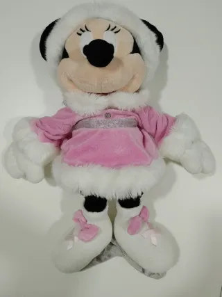 Peluche da Minnie Mouse, ideal para colecionadores ou fãs da Disney. Representa a Minnie com um traje de inverno. Mede aproximadamente 50 cm. - Traje rosa com detalhes brancos e prateados. - Chapéu de inverno com pompom. - Patins de gelo nos pés.