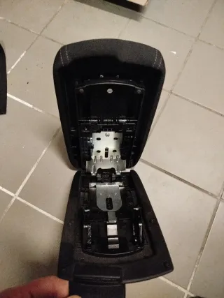 Apoio de braço em tecido preto. - Parte superior acolchoada. - Mecanismo de abertura visível. ** Para Pecas
